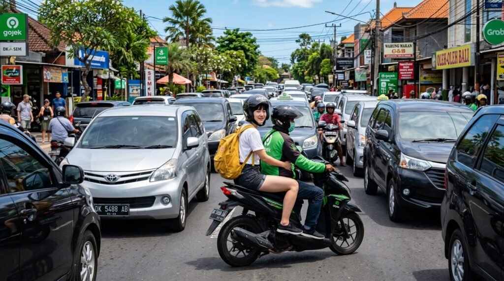 발리에서는 그랩(Grab)보다 고젝(Gojek)이 더 잘 잡힙니다. 가까운 거리 식당이나 비치클럽 갈 때는 무조건 ‘오토바이(GoRide)’를 호출하세요. 차들 사이를 요리조리 뚫고 1,000~2,000원대에 순식간에 목적지에 도착하는 마법을 경험할 수 있습니다.