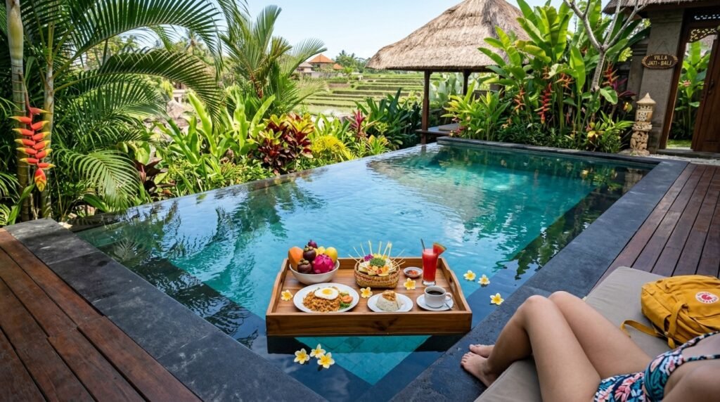 우리만의 단독 수영장에서 플로팅 조식(물에 띄워주는 아침 식사)을 먹으며 인스타 인생샷 100장은 기본으로 건질 수 있습니다. 스미냑 메인 거리와도 가까워 도보나 오토바이로 이동하기 최적입니다.